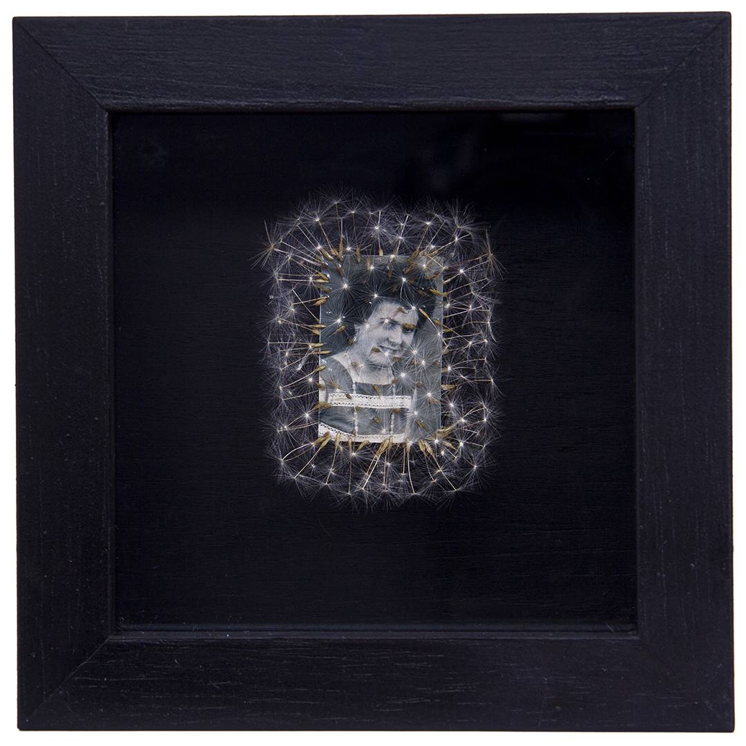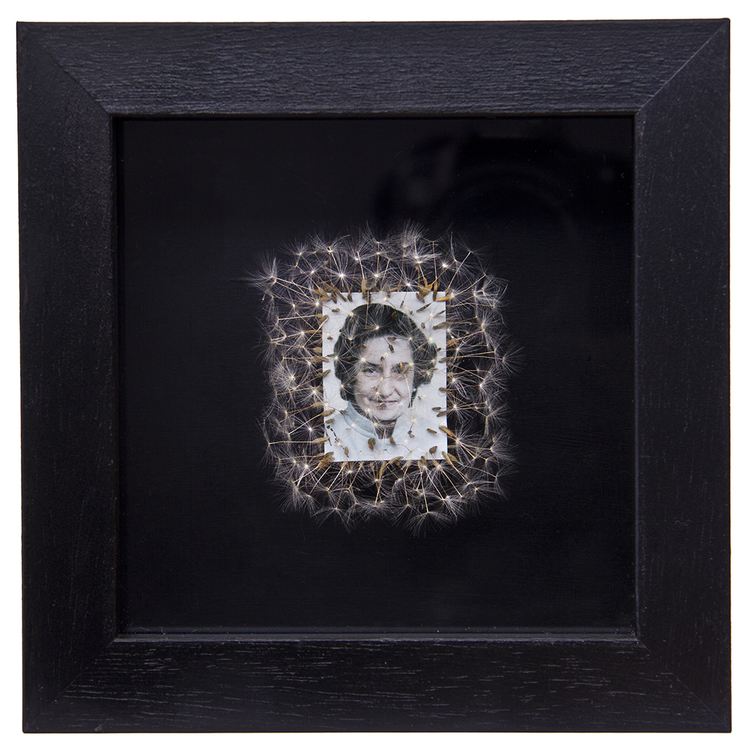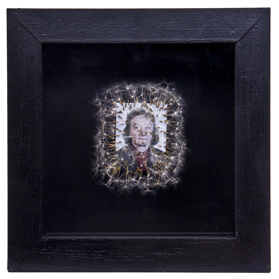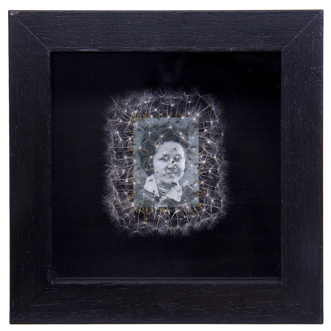 Vitrina de 15 x 15 cm. Semillas de dientes de león y fotografía.