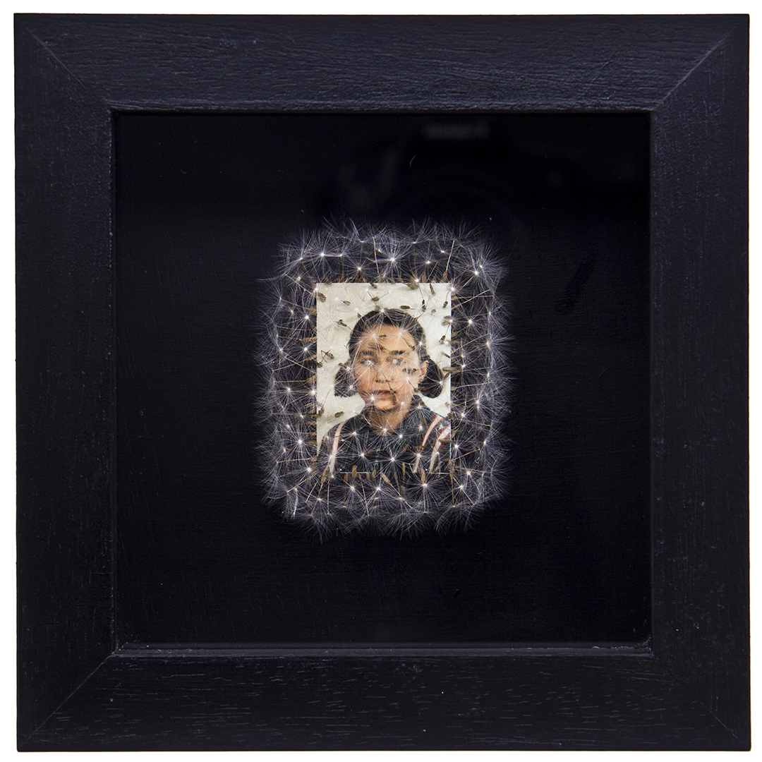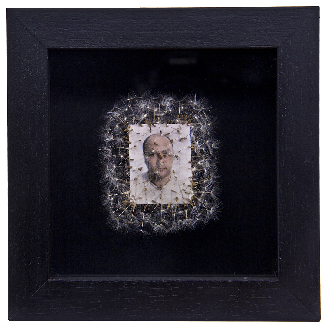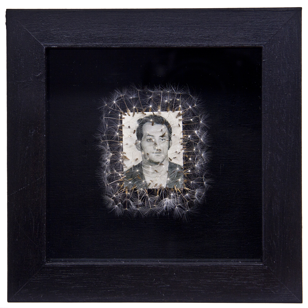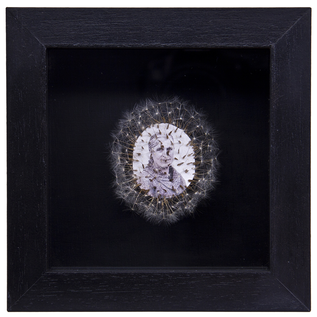 Vitrina de 15 x 15 cm. Semillas de dientes de león y fotografía.