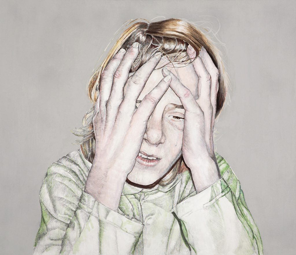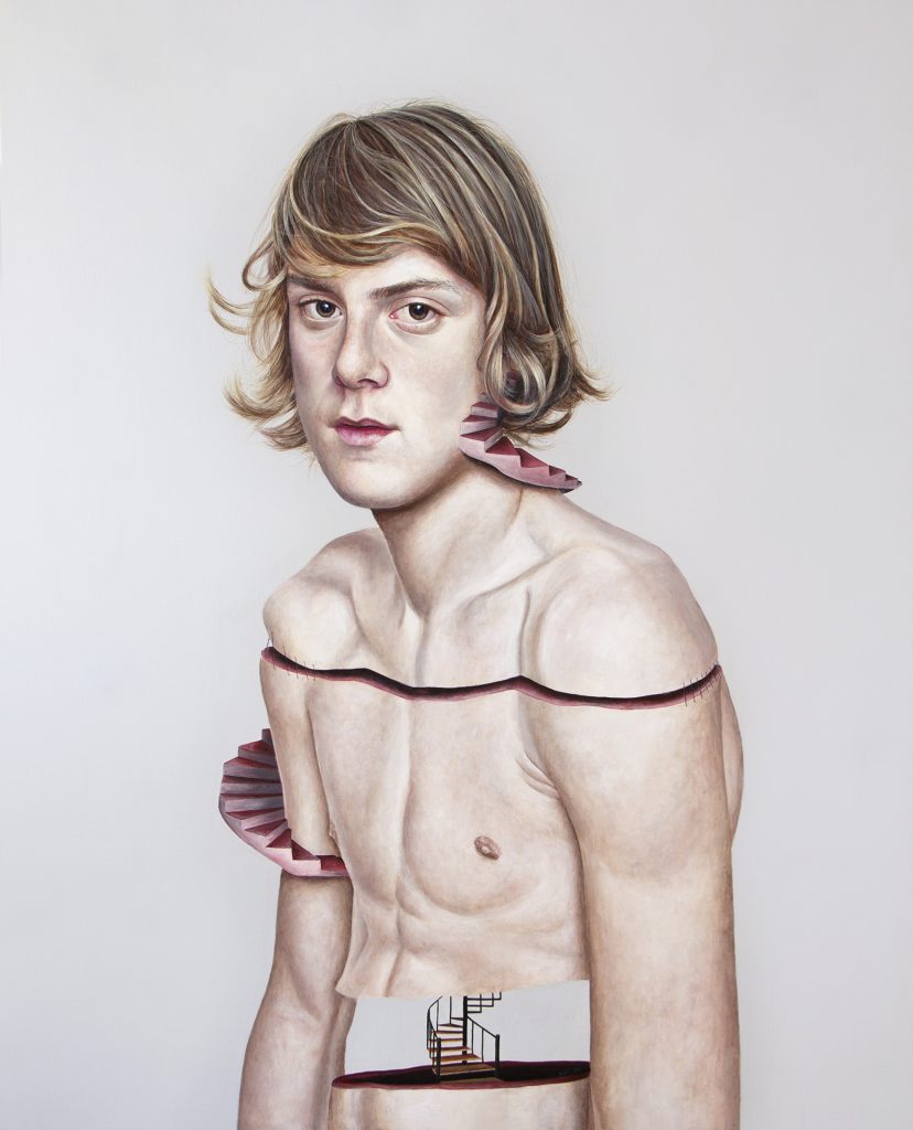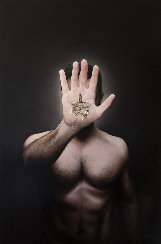 Óleo sobre lienzo, hilo y piel humana